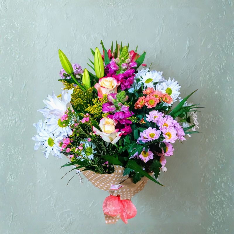 Un ramo de flores de regalo con alelís aromáticos y Lilium, con una base de verde rodeando el ramo. Compra tus flores online y el reparto es gratuito en Aranda de Duero